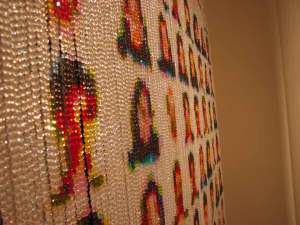 Taraneh’s been creating a lot of work that utilizes images downloaded from the web, such as her mixed-media piece Women In Tehran (2007), in which she threaded together small cut-out pictures of downloaded images of women from the Iranian capital city. Her larger 2007 installation, Most Wanted, included a beaded curtain that replicated a poster of fugitive Islamic terrorists that she found on-line, its fuzzy and indistinct images suggesting a culturalist compositing of all Muslims into an overarcing mashup of conflated identity.