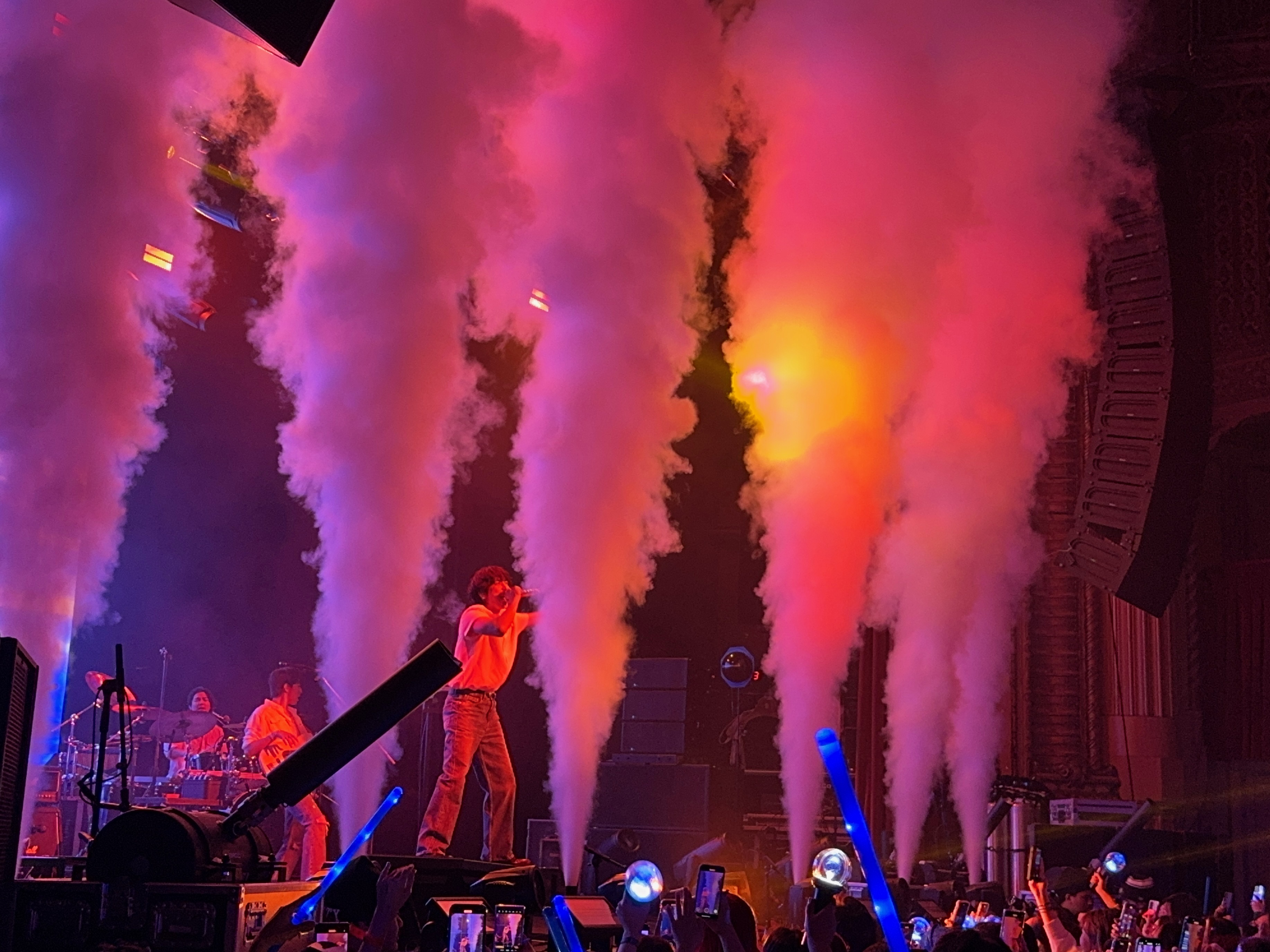 Since it was the last night of the tour he and the other two members left it all out on the stage and once again their enthusiasm and love of performing was infectious, as the audience lustily sang along throughout the show. The effects were not extensive, but the confetti was strategically abundant. At one point red and blue streamers shot from cannons at the front of the stage, draping dramatically on the riggings on the Warfield’s high ceilings. Yonghwa also slightly favored his right leg again, but he still managed to dance exuberantly and hype up the crowd, especially during the last set, which included their disco classic Cinderella. The high-powered rock song Between Us, the penultimate song of the show, took off like rocket fuel while Yonghwa danced like a dervish and adlibbed ecstatic high notes and harmonies.